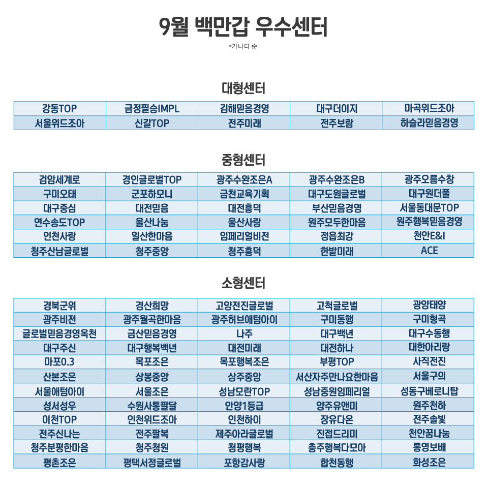 25년도 9월 백만갑 우수센터 수상센터를 아래와 같이 안내 드립니다.
